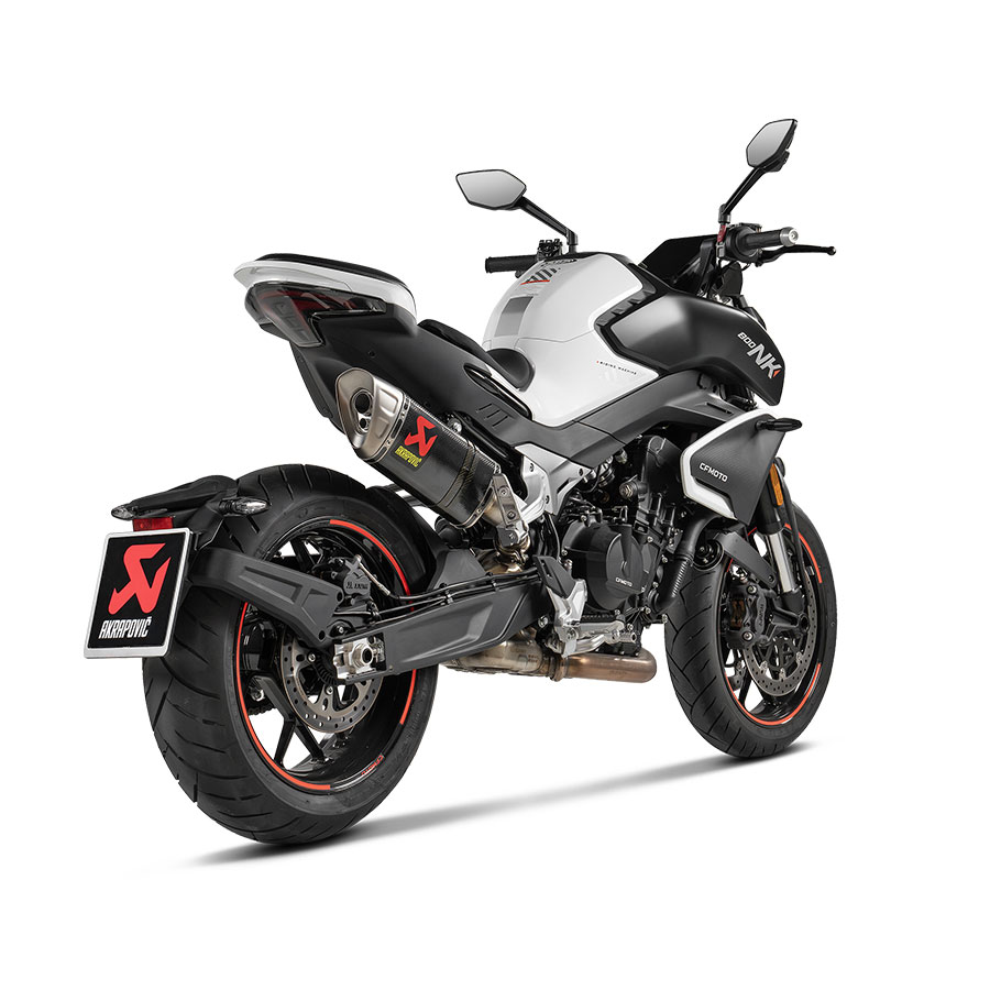 Bu ürün, motosikletin çizgileri ve renk şemasıyla kusursuz bir şekilde bütünleşen, kompakt yarıştan ilham alan bir görünüme sahiptir. Karbon fiber susturucu dış kılıfı ve susturucu kelepçesi, titanyum uç kapağı ve paslanmaz çelik bağlantı borusu gibi yarışlarda kanıtlanmış malzemelerden üretilmiştir. Bu standart stok sistemine kıyasla %30,6 (0,9 kg) ağırlık tasarrufu sağlar ve 799 cc çift silindirli motoru vurgulayan derin bir sportif ton üretir. Geliştirme süreci gaz tepkisi ve sürüş kabiliyetine odaklandı. Akrapovič’in kendi dinamometresinde test edildiği ve standart stok egzoz sistemiyle donatılmış bir CFMOTO 800NK ile karşılaştırıldığında, özellikle orta ve üst devir aralıklarında 1,3 kW (1,7 hp) güç ve 4.900 devirde 2,5 Nm tork artışıyla performans kazanımları sağlıyor. EC/ECE tip onaylıdır ve yeniden haritalama ihtiyacı olmadan kolayca takılabilir .