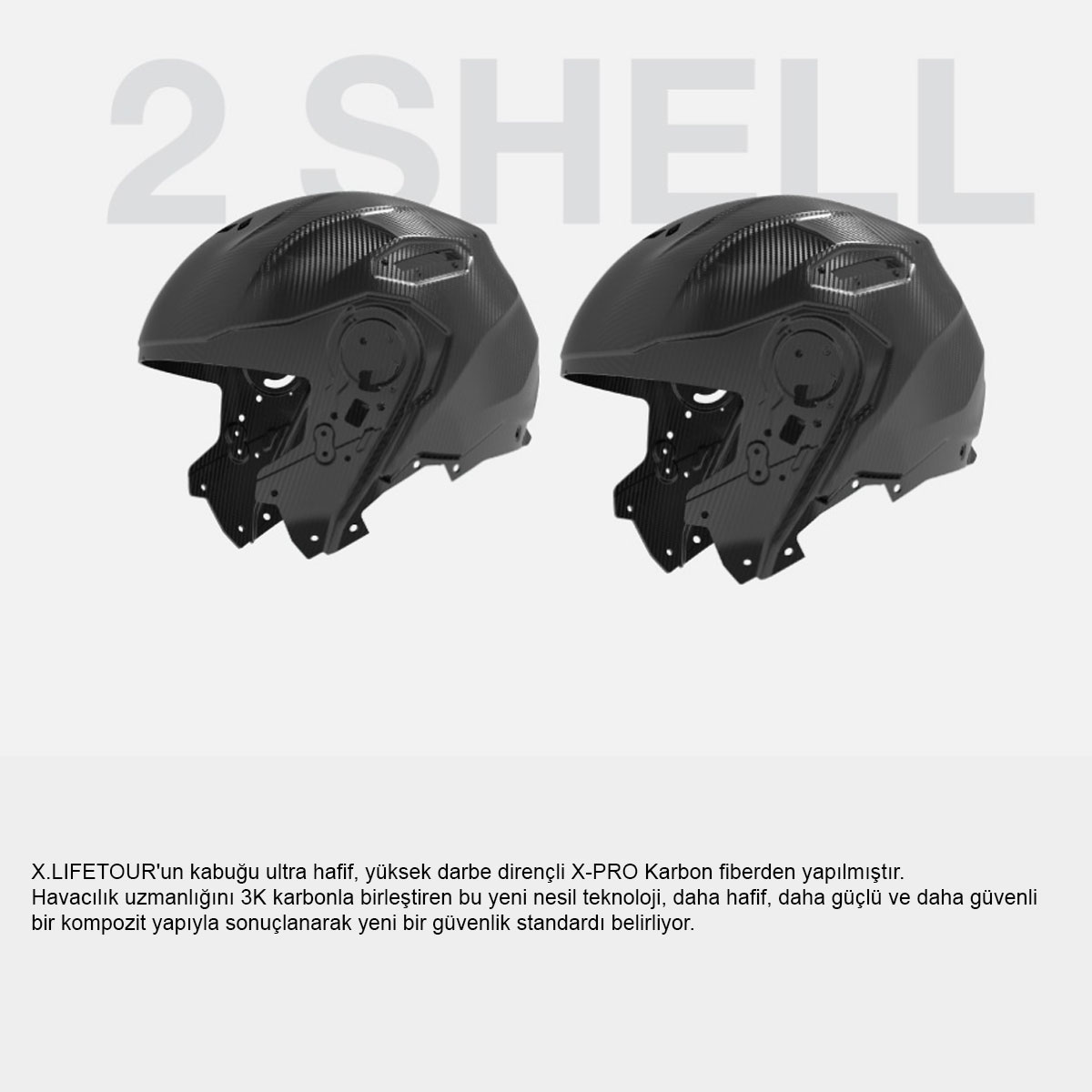 • X.LIFETOUR’un kabuğu daha hafif, daha güçlü ve daha konforlu hale getiren kompozit bir yapı elde etmek için yeni nesil bir teknoloji olan ultra hafif, darbeye dayanıklı X-PRO Karbon fiberden yapılmıştır