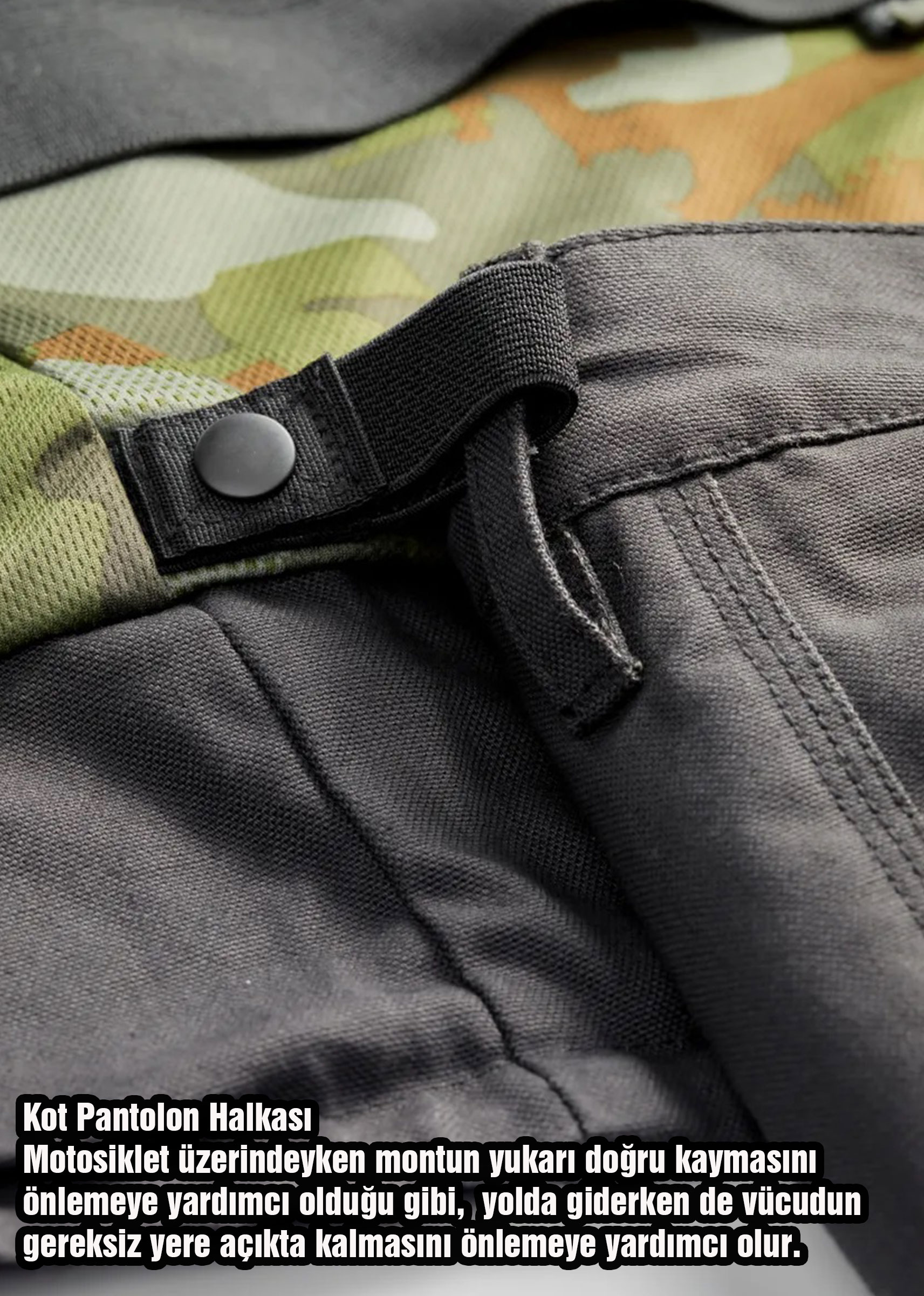 • Günlük pantolonların kemerleriyle sabitlenmesi için sabitleme kancaları