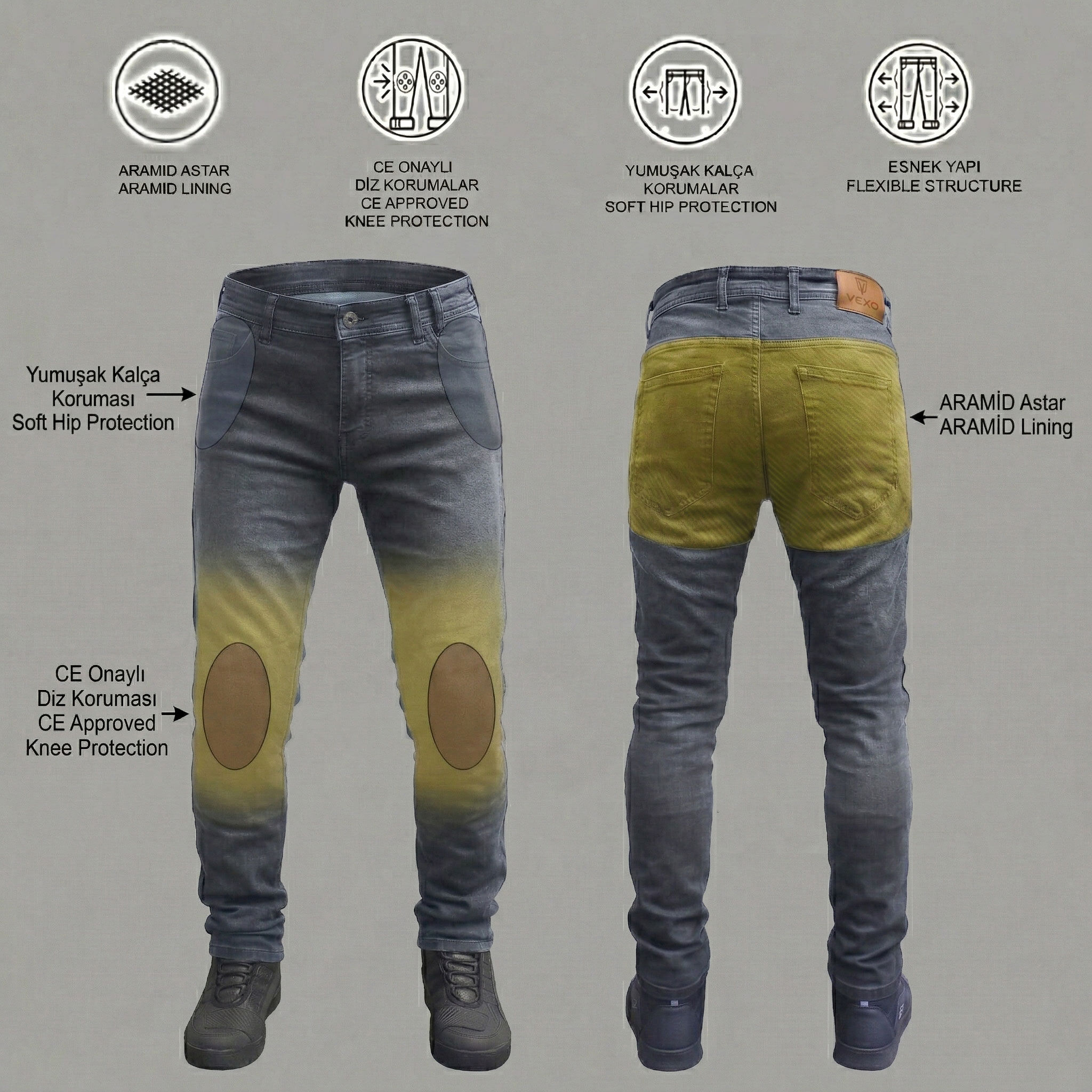 VEXO TITANS Kot Pantolonlar Denim kumaştan üretilmiş olup güvenliğinizi benzersiz bir şekilde sağlarken, konforunuzdan ve stilinizden ödün vermez. Pantolonda darbe ve sürtünme dayanımı için Aramid astar kullanılmaktadır. Dizlerde CE korumalı ve kalça kısımlarında soft korumalar kullanılmaktadır. VEXO TITANS kot pantolonları ile günlük kot pantolonun rahatlığını ve şıklığını yaşayacaksınız.