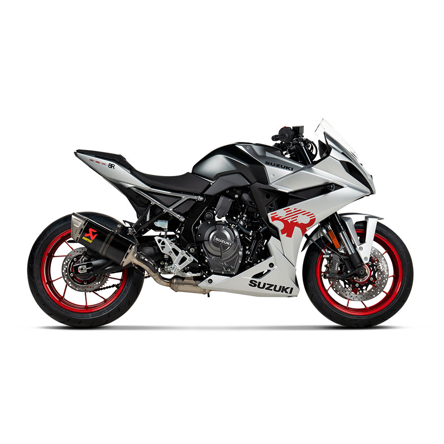 Bu, sıfırdan tasarlanmış ve hafif, yarışlarda kanıtlanmış malzemeler kullanılarak üretilmiş tamamen yeni bir egzozdur. Karbon fiber susturucu dış kılıfı, ısı kalkanı ve kelepçe, titanyum uç kapağı, paslanmaz çelik başlık, rezonatör ve bağlantı borusu ve siyah kaplamalı alüminyum susturucu braketi, stok egzoza göre %39,6 (3,2 kg) ağırlık tasarrufu sağlar . Egzozun alternatif yönlendirilmesi, onu makinenin sağ tarafına yerleştirir (standart versiyon motosikletin altına girer), daha fazla yarış stiliyle sonuçlanır ve karbon fiber ısı kalkanı ısıdan koruma ve çekici bir son dokunuş sağlar. Akrapovič dinamometresinde test edildiğinde ve standart stok sistemiyle donatılmış bir Suzuki GSX-8S ile karşılaştırıldığında sırasıyla 9.200 rpm’de 4,7 kW (6,4 hp) ve 7.650 rpm’de 4,7 Nm güç ve tork artışı sunar. Egzozun bağlantı borusunda bulunan rezonatör, sürücüye yarışçı ve canlı bir tonla benzersiz bir ses deneyimi yaşatırken, performanstan da ödün vermiyor. Bu egzoz sistemi orijinal Suzuki soft yan çanta setiyle uyumludur. Euro5+ modellerde Racing Line (Karbon) egzoz sistemi takıldığında motor arıza ışığı yanacağından ECU’nun yeniden eşlenmesi zorunludur.